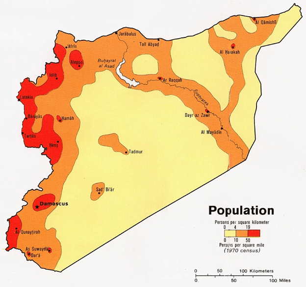 En definitiva, el lector debe recordar que hace 241 años Estados Unidos, Francia e Inglaterra eran Estados Unidos, Francia e Inglaterra y se gobernaban a sí mismos, sin embargo, hace 100 años Siria no existía en el mapa y hace 72 años no se gobernaba a sí misma; además, Siria a diferencia de los países de occidente antes mencionados, jamás decidió sus fronteras, las decidieron por ellos con base en conveniencias geopolíticas y no en criterios fundamentados en sus necesidades económicas, demográficas, culturales y sociales. Por lo cual este país posee profundos errores de diseño, errores en su arquitectura geográfica. Es difícil imaginar la implementación de proyectos sociales en países como Siria, que además posee agua solo en una pequeña porción de su territorio y en el cual entre su poblado y sus fuentes de recursos naturales media un desierto de 200,000 millas cuadradas (como puede observarse en la Figura 7), según reporta (Encyclopædia Britannica, 2017); además, es un país que siempre ha estado siendo desestabilizado e inclusive controlado por las principales potencias de occidente, donde existe una profunda contradicción ideológica-religiosa que, aunada al el intervencionismo extranjero, les dificulta sobremanera alcanzar la cohesión social y política mínima que les permita salir adelante como Estado-Nacional. No resulta extraño que BAAZ use constantemente la represión para mantenerse en el poder y que esto genere estallidos sociales que alcancen el estatus de guerra civil, tal y como ha sucedido en diversos países de occidente a lo largo del siglo pasado, que enfrenaban problemas socio-económicos de muchísima menor envergadura que Siria.