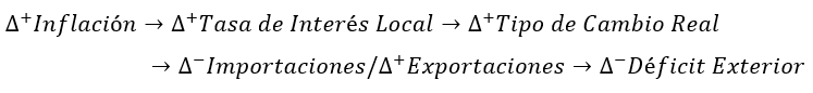 Sin embargo, esta política monetaria contractiva tendrá otro efecto, el cual es atraer a los prestamistas de capital-dinero debido al diferencial de tasas de interés entre la economía doméstica y el resto del mundo, es decir, incentivará la entrada de capitales del exterior. Con este diferencial de tasas se generará una abundancia de dólares que los prestamistas de capital-dinero provenientes del extranjero buscarán cambiar por moneda local, con lo cual se apreciará el tipo de cambio nominal (pues se empezará a demandar más la moneda local respecto a la divisa o moneda extranjera) y con ello, se apreciará el tipo de cambio real (concebido como ), lo que a su vez ocasionará un incremento de la vulnerabilidad de la economía nacional debido a la contracción de las exportaciones respecto a las importaciones (porque dada la apreciación real se pierde competitividad vía tipo de cambio[2] y con ello, es más barato importar, pero al encarecerse la producción doméstica respecto al período anterior se pierde demanda en el mercado internacional), lo que incrementará el déficit en cuenta corriente, no por necesidad de ahorro externo sino por afectación de los precios relativos de la economía respecto al resto del mundo.