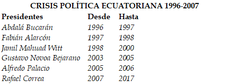 [10] Según (Mora, 2013, pág. 50), “Desde el año 1996 hasta el 2007 Ecuador tuvo siete presi-dente, tres de ellos fueron derrocados por sus mandantes, una destituida por el Congreso Nacional, otro ocupó el cargo de presidente interino y tres terminaron períodos que no iniciaron. Para la mayoría de los ecuatorianos esto significa que el triunfo de siete elecciones continuas, no sólo le otorga a Rafael Correa un papel de líder nacional, sino que le da consistencia al proceso democrático ecuatoriano.”
