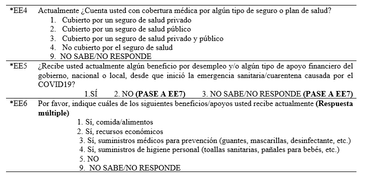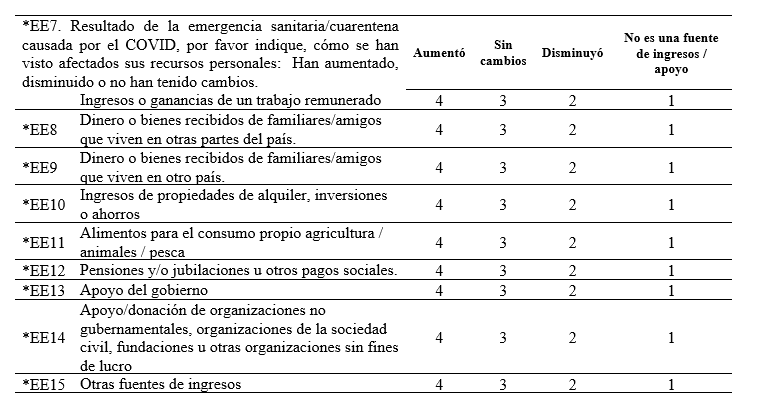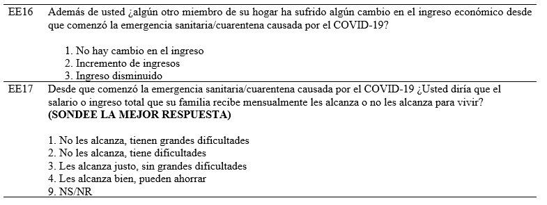 Además, debe destacarse que las preguntas han sido diseñadas de esta forma para que sea posible captar la estructura del ingreso de los encuestados, determinada dicha estructura por la relación que los encuestados con producción social en general: si viven de su fuerza de trabajo pertenecen a la clase trabajadora y ha diseñado el cuestionario de tal manera que clasifique a esta clase social como aquellos encuestados que viven mayoritariamente de un salario o del comercio informal (no se considera al comerciante informal como un “empresario”, en el sentido tradicional de la palabra, a causa del bajo nivel de división social del trabajo de esas unidades productivas y del bajo nivel de acumulación de capital que suele presentarse en dichas unidades), mientras que como la clase capitalista a quienes no viven mayoritariamente de su fuerza de trabajo; se dice “mayoritariamente” porque en no aisladas ocasiones las fuentes de ingreso de una persona o un hogar pueden ser mixtas. Así, se busca medir el flujo mensual de ingreso y determinar si viven de su fuerza de trabajo o no, en conjunto con la afectación que el actual escenario social ha tenido en dicho flujo.